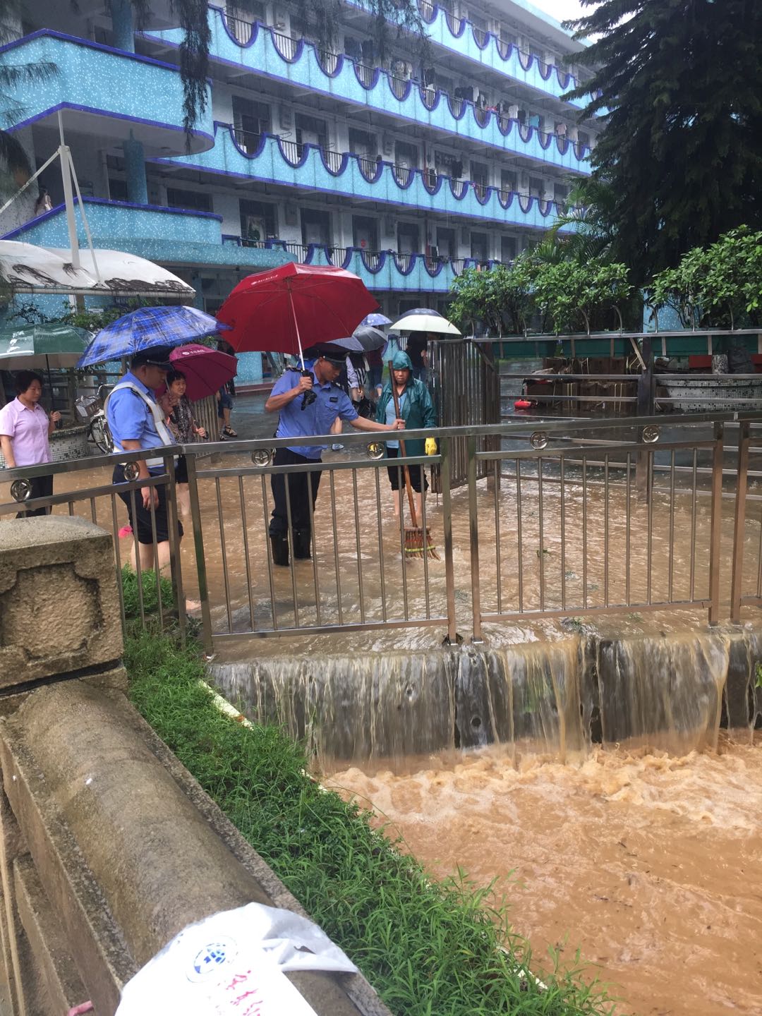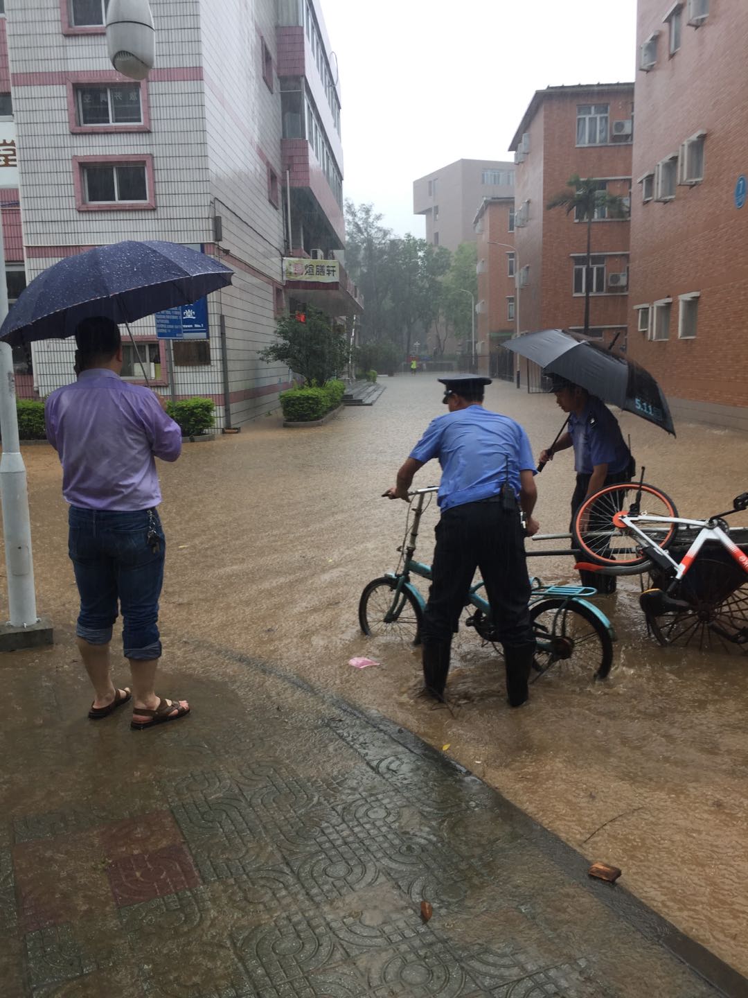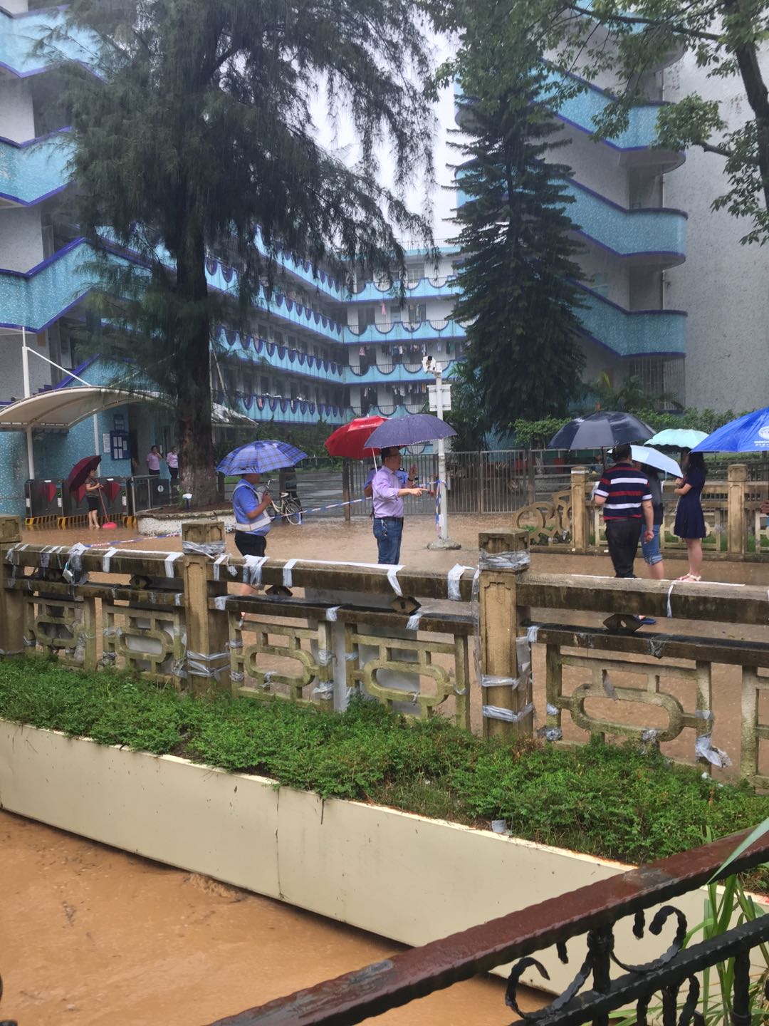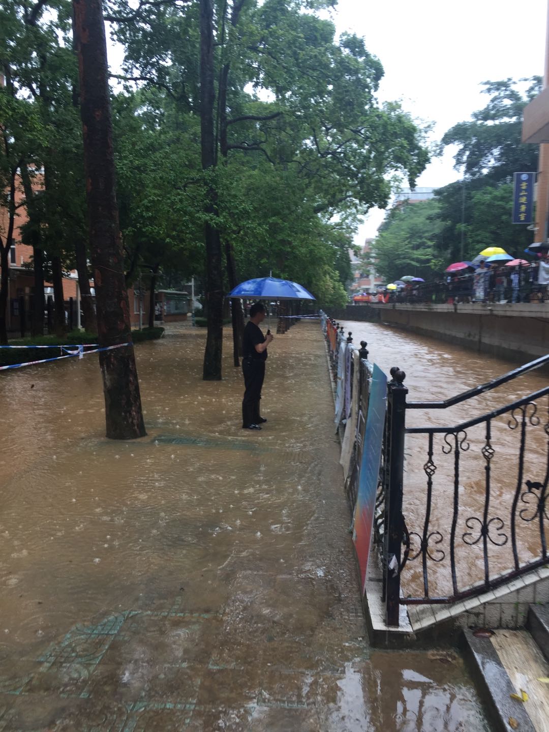 6月8日,广州市持续出现大暴雨至特大暴雨,我校南北校区受到不同程度的水浸,尤其是北校区云溪河水暴涨,部分学生宿舍、行政楼以及教学楼一楼进水,学生宿舍7、8、9栋一楼水浸情况最为严重。为避免出现安全事故,保卫处立即启动突发事件应急预案,全体干部和校卫队员第一时间冒雨赶赴水浸现场,一是对沙井、水深地点周边拉起警戒线,安排专人驻守并提醒过往师生注意安全和绕道行走;二是通过保卫处微信公众平台发布暴雨紧急通知,提醒师生注意安全,防止意外发生;三是总值班室逐一打电话通知将机动车停放在低洼处的教职员工,让其马上将机动车开往高处停放。